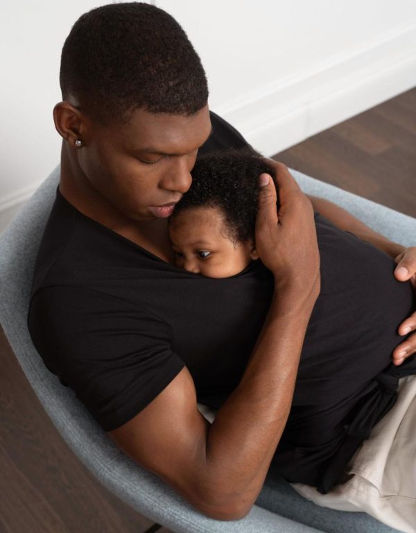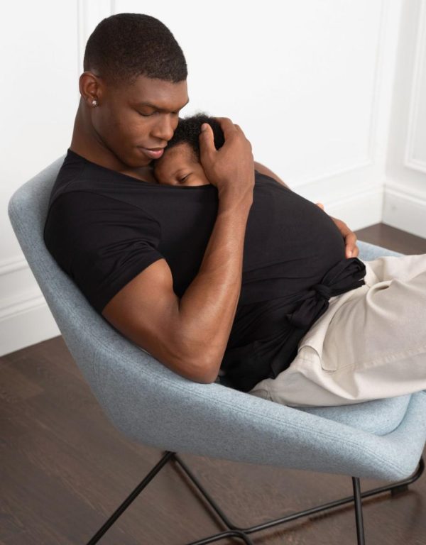 For a new dad, skin to skin time with his newborn not only soothes baby, but can actually help to re-wire dad’s brain ready for fatherhood. Our Men’s Skin to Skin Top is designed to help him enjoy this essential snuggle time, hands-free. Made in soft stretch cotton, it’s gentle on baby’s skin & suitable for use from day 1. Baby slips inside the front of the top against dad’s chest while wrap ties secure & support the little one in the optimal position.